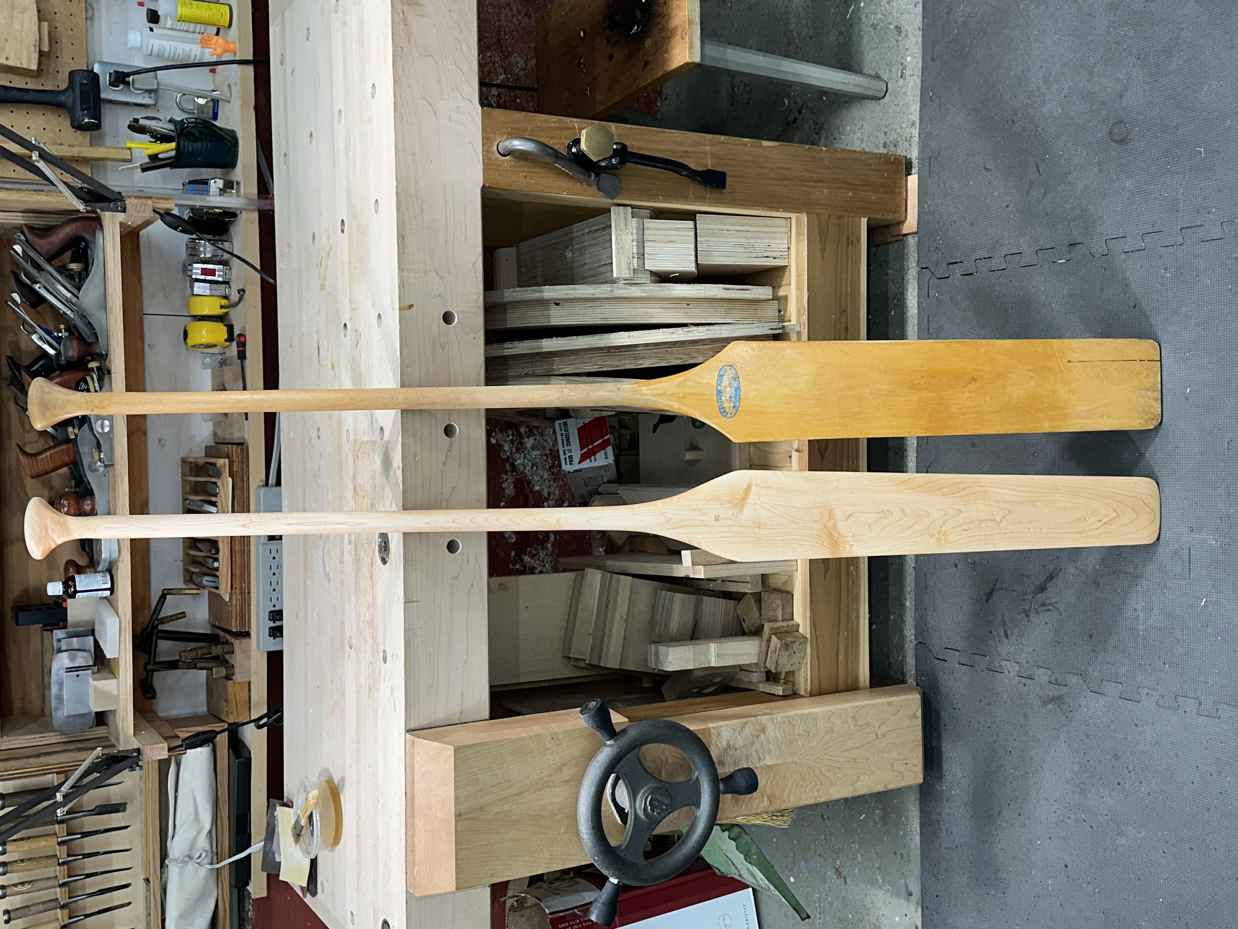 Last week as I finished painting Neegik I realized that I needed to find a distraction. Something that would keep me from rushing into the final cleanup work instead of patiently letting the paint cure. A new flatwater paddle would be the ideal project. Over the years I’ve tried making them but could never quite get the lively flex and spring of my Grassmere.