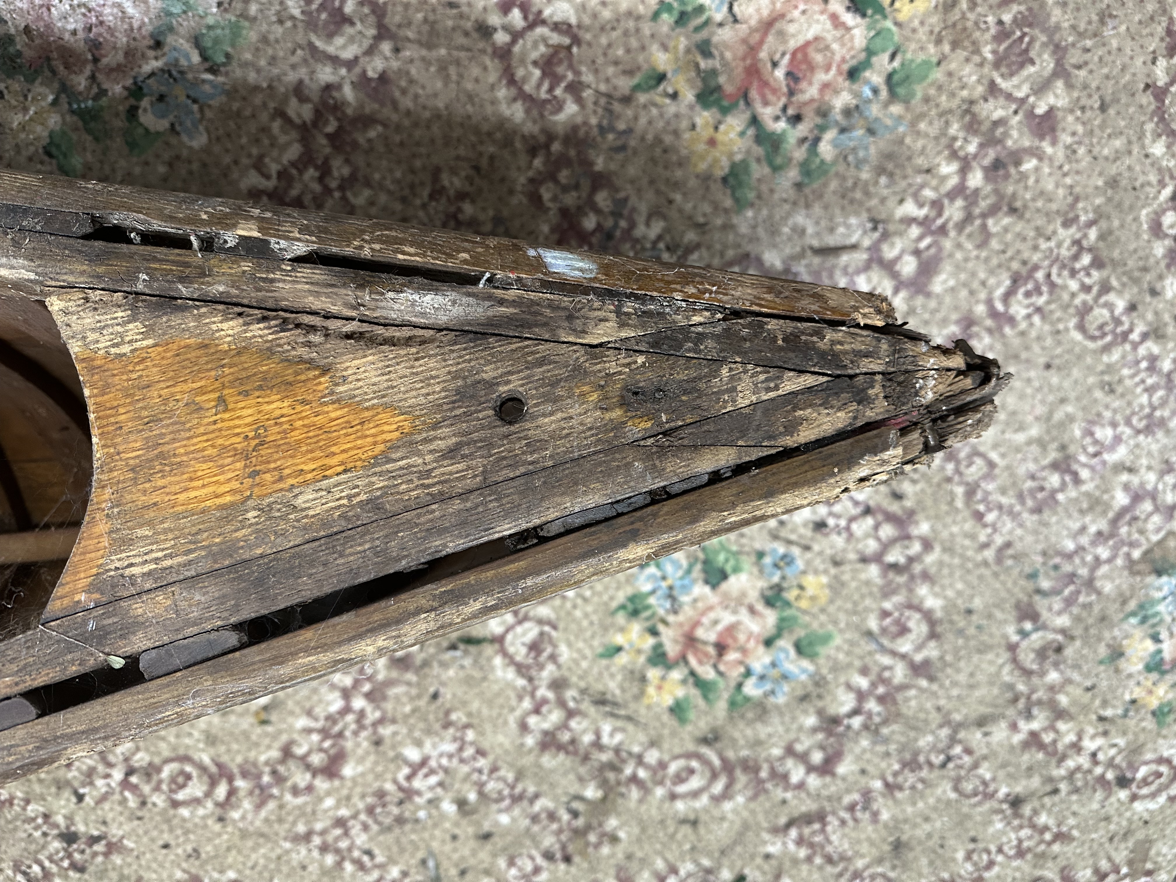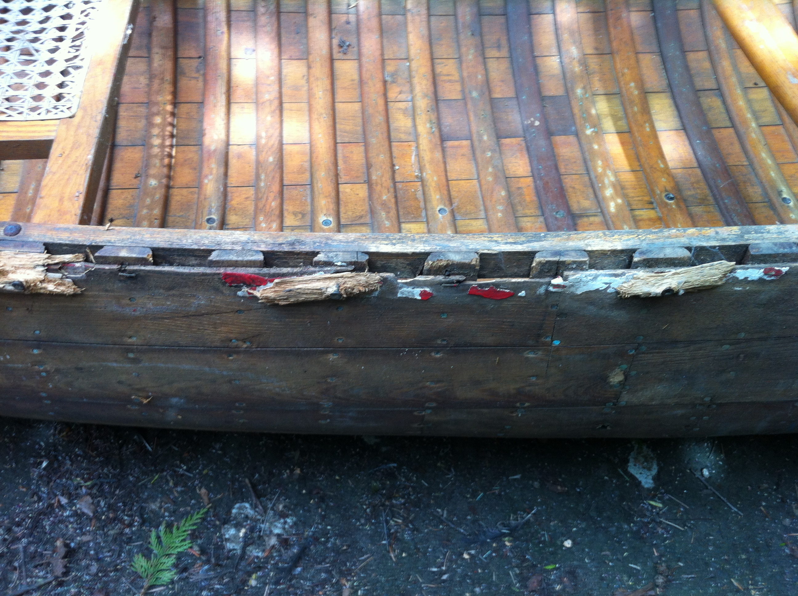 The canoe had been restored at least once before. The inwales had been patched at the decks and two ribs had been replaced. The outwales had probably also been replaced. Judging by the corrosion on the metal parts this boat had been paddled in salt water and not well rinsed afterwards. The boat did not show much damage from use but it had clearly not been stored well.