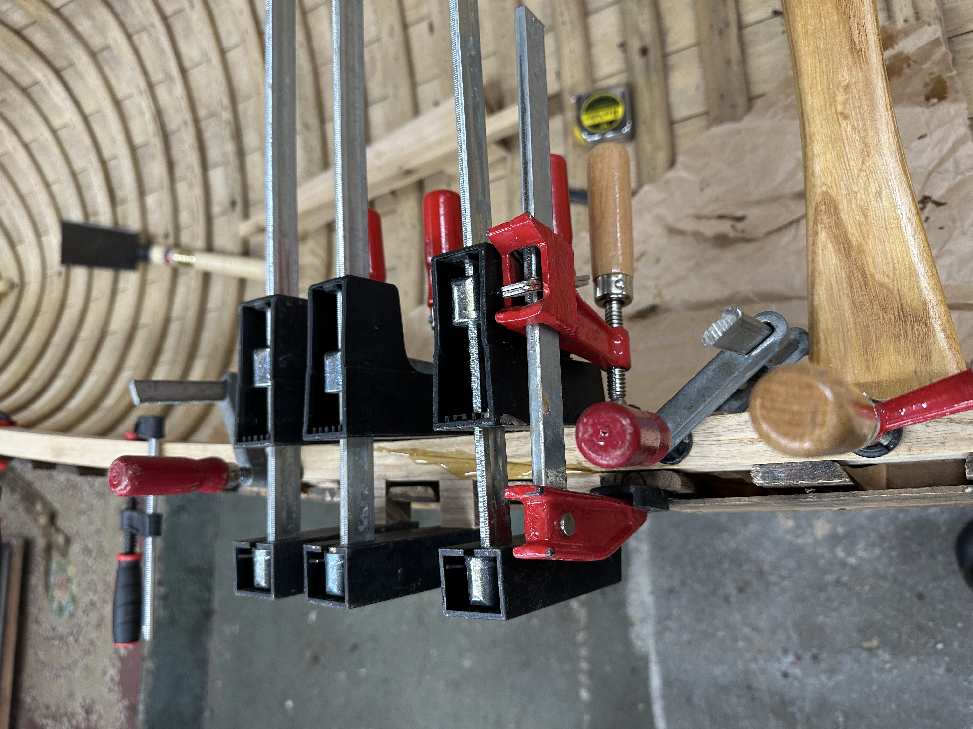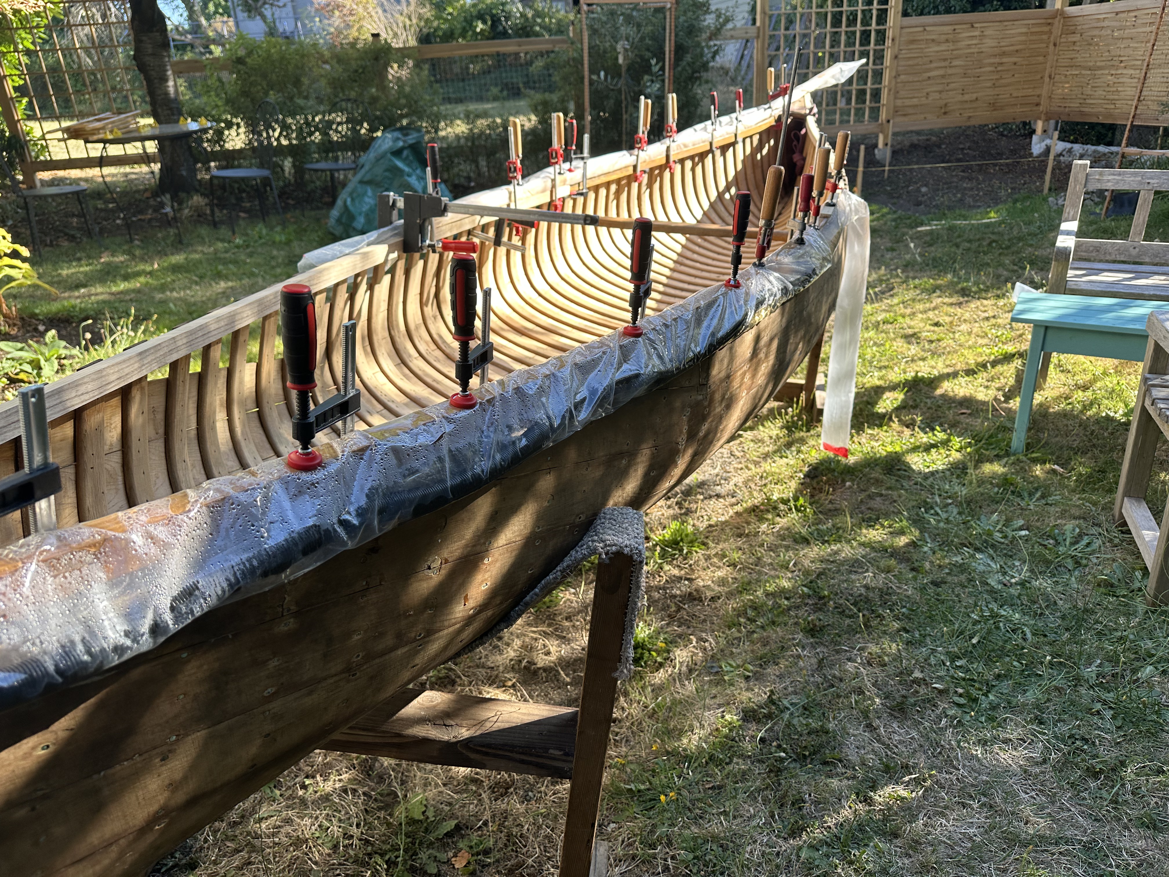 The old inwales were solid enough that I could use them as forms for steam bending new inwales. I had recently learned that 6mil plastic tube is a great altenative to a steam box for steaming long objects. I milled four strips of ash for the new inwale. It would have been great to have had 16’ lengths of ash to work with, but no such luck. I would have to scarf shorter pieces together. The wood was soaked for a couple of days before it was steam bent, two segments at a time, using the old inwales as a form.