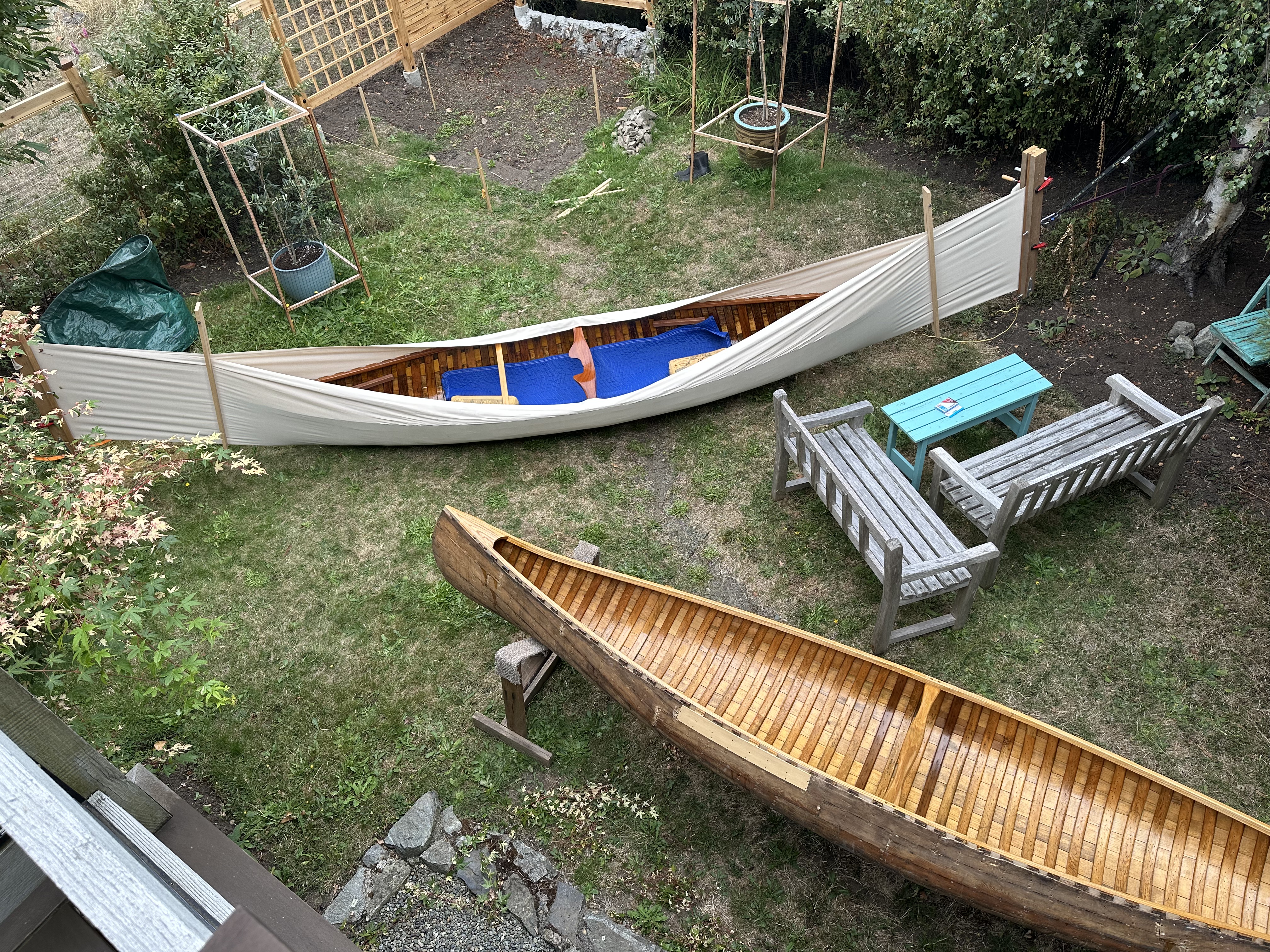There were two canoes in the shop through August and Fall 2025. I’ll write about the other boat in a subsequent post. The canoes had different stories, different characters, and different issues. But they both needed new canvas, filler, and paint. Given the amount of fuss and preparation associated with those tasks it just made sense to do them both at the same time. Also, late August was a good time to work in the back yard.