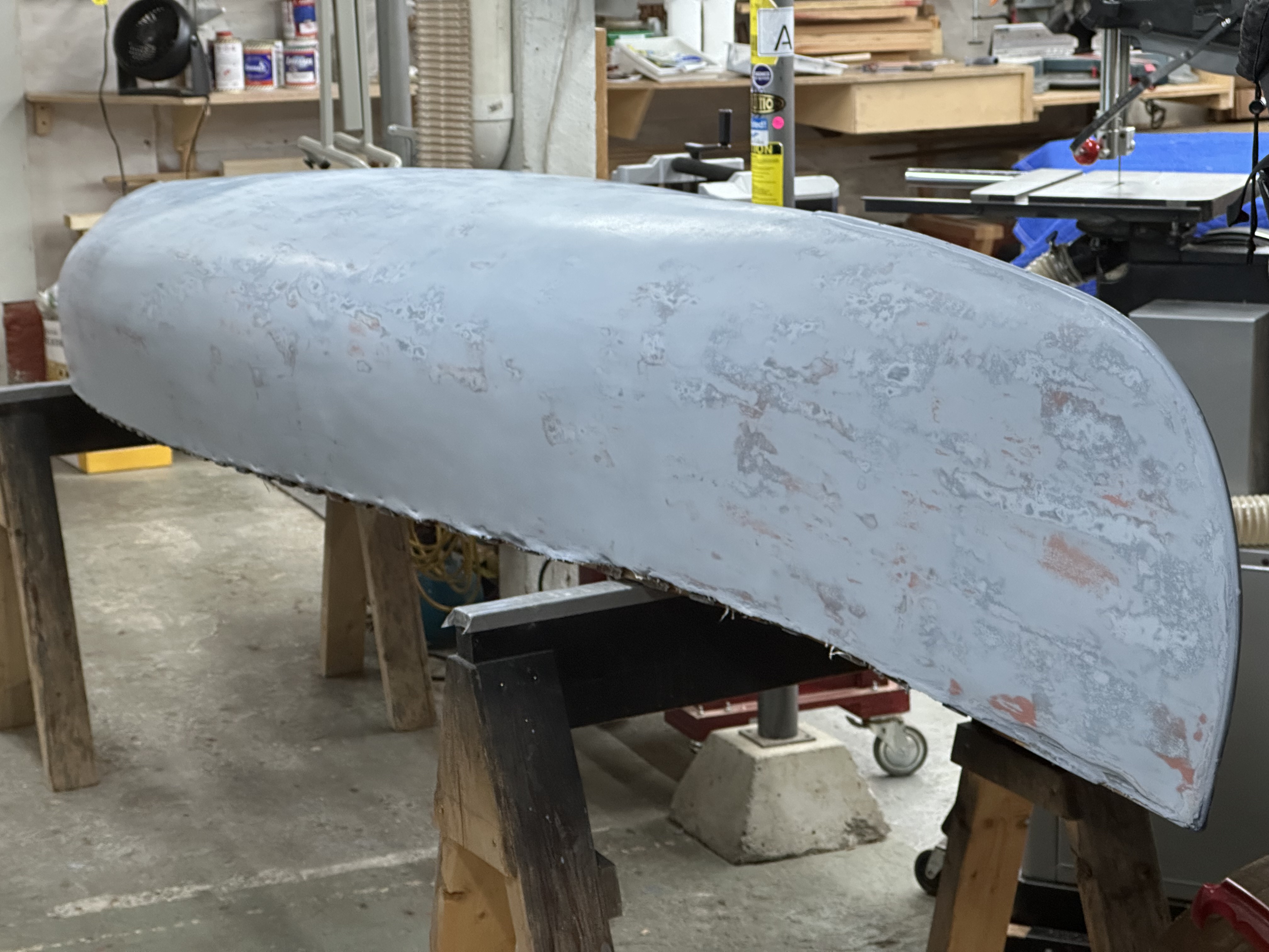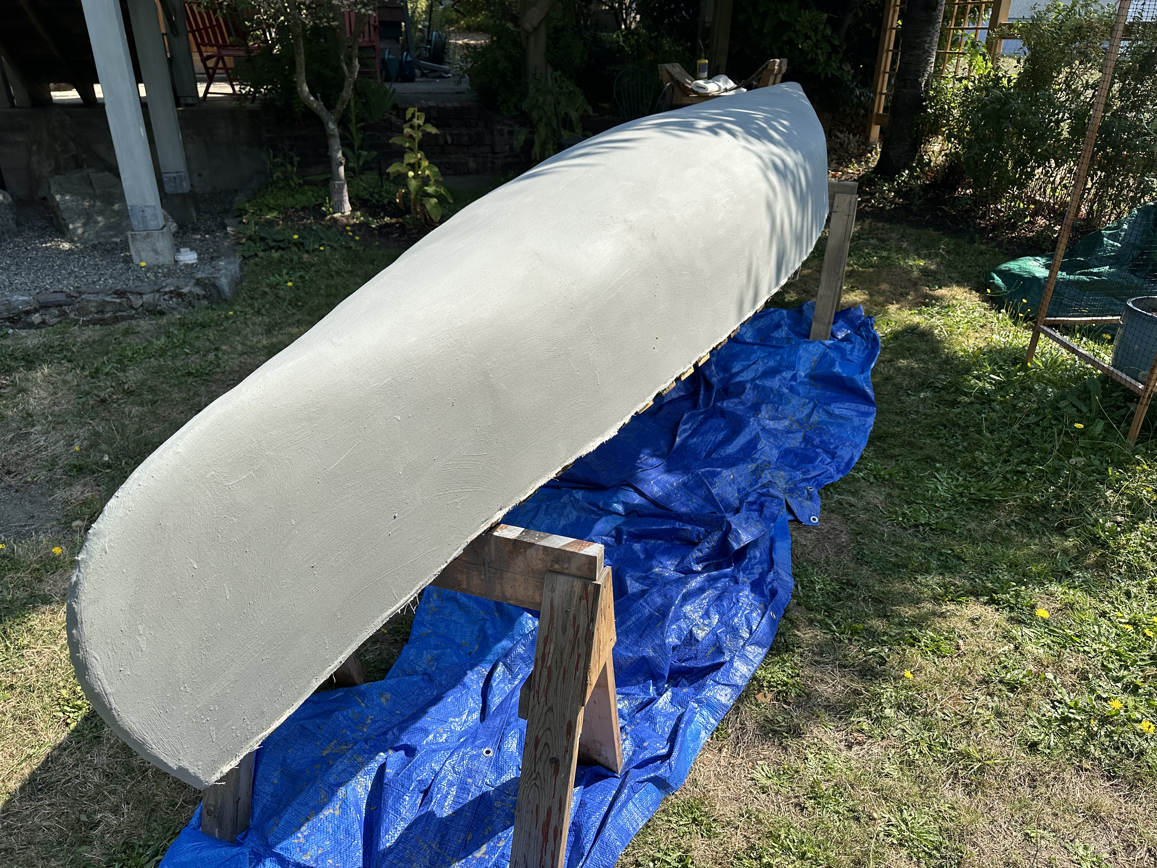 A couple of weeks later it was time to fill the canvas. I mixed up enough filler for two canoes and did them both on consecutive days. This was the first time that I had worked with conventional enamel/oil/silica filler. It’s messy and takes a month or more to cure, but it forms a really hard surface. Later on in the year, as I was sanding and priming the filler, I discovered that I should have taken more care to properly smooth the filler when it was wet. It was a lot of work to fix all the imperfections in the sanding and priming stage.